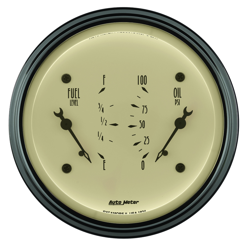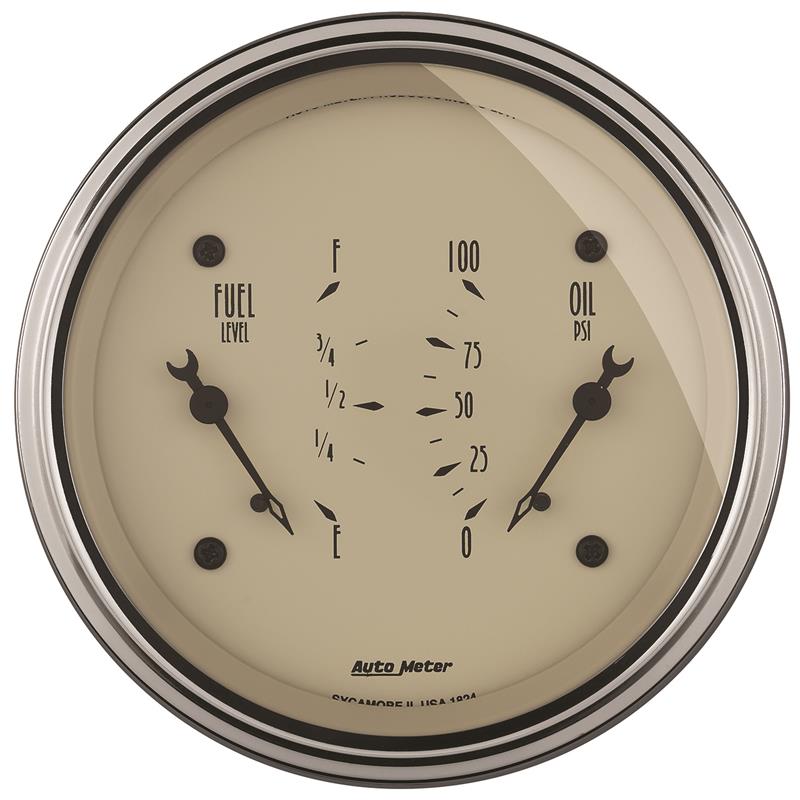AutoMeter Gauge Dual Fuel & Oilp 3-3/8in. 0 Ohm(e) to 90 Ohm(f)& 100PSI Elec Antique Beige