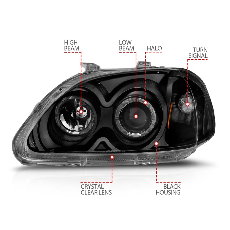 ANZO 1996-1998 Honda Civic Projector Headlights w/ Halo Black
